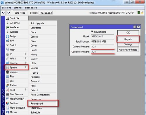 – Тепер перезапускаємо роутер, щоб прошивка набула чинності. Ймовірно, що може відбутися оновлення, яке не торкнеться завантажувач систему. Щоб перевірити версію, потрібно буде зробити це власноруч. Вибираємо «System», а після «RouterBoard». У віконці буде вся інформація про версію завантажувача. Якщо параметри виявилися різні, то процедура поновлення повинна бути запущена кнопкою «Upgrade».