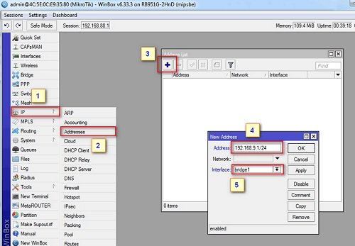1. Першим ділом потрібно буде встановити саме статичний «айпішнік». Робиться це через вікно «Adresses», де потрібно заповнити спеціальне поле «Ip провайдера», а також interface (ім’я вашого порту, в нашому випадку – ether 5), а після NetWork або маску підмережі.