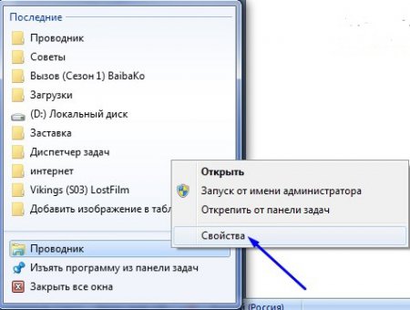 1. Клацніть правою кнопкою миші по ярлику «Провідник». Потім знову правою кнопкою миші натисніть на пункт «Провідник» відкрився контекстного меню. Далі натискаємо «Властивості».