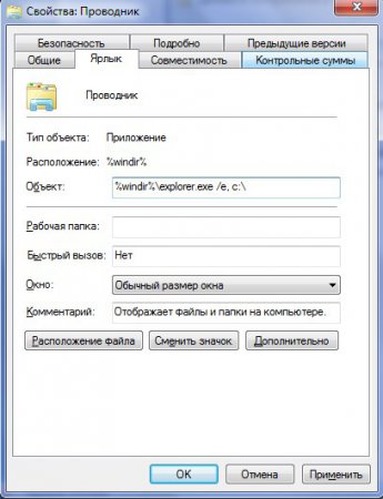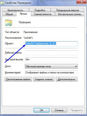 2. Відкриється діалогове вікно «Властивості: Провідник». В полі «Об’єкт» прописаний шлях до бібліотеки. Для прикладу давайте зробимо так, щоб при натисканні на ярлик «Провідник» відкривався «Локальний диск D» або «Локальний диск C».