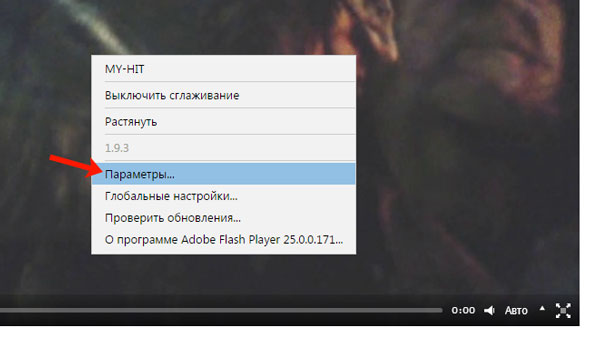 Щоб навантаження Плеєра на браузер трохи знизилася, використовується апаратне прискорення. Але воно так само може стати причиною виниклих проблем з відображенням flash-контенту. Вимкнути його можна наступним чином. Відкрийте будь-який сайт, на якому є вікно Флеш Плеєра. Натисніть на Плеєрі правою кнопкою мишки і виберіть «Параметри».