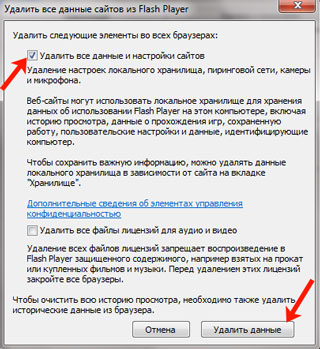 Потім переконайтеся, що стоїть галочка в полі «Видалити всі дані і настройки сайтів» і натисніть кнопку «Видалити дані».