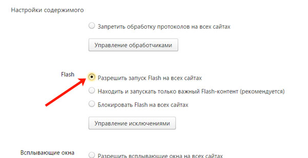 Може трапитися і так, що Флеш Плеєр не працює, тому що даний плагін відключена в налаштуваннях самого браузера. Для цього потрібно відкрити сторінку з налаштуваннями і подивитися, щоб в потрібному нам розділі було обрано «Дозволити запуск Flash на всіх сайтах».
