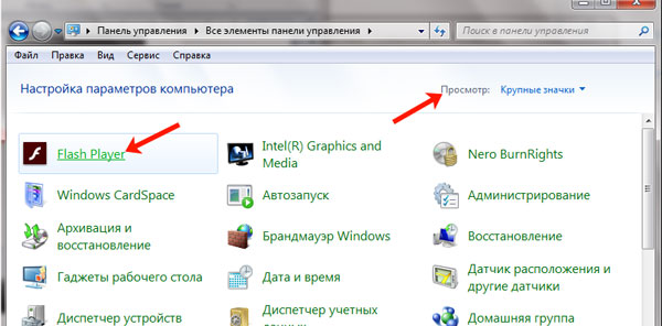 Далі виберіть «Перегляд» – «Великі значки» і знайдіть пункт «Flash Player».