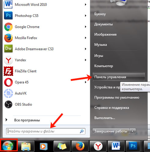 Проблеми могли з’явитися і через збій налаштувань, які були збережені на комп’ютері для оглядачів. Відповідно, їх потрібно видалити. Для цього зайдіть в «Панель управління». На Windows 7 натисніть на кнопку «Пуск» і виберіть дані пункт праворуч або знайдіть його, скориставшись рядком пошуку.