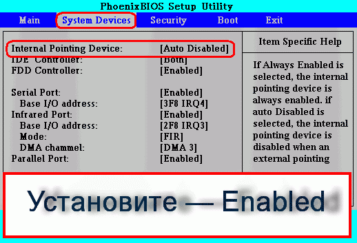 - Цілком може так складеться що «завдяки» системного збою, в БІОС налаштуваннях ноутбука може відбутися зміна робочих параметрів використовуваного пристрою. Рішення елементарно в повторенні: увійдіть в БІОС лептопа (як це зробити написано тут), відшукайте пункт «Internal Pointing Device» і перевірте стан задіяних у ньому налаштувань. У будь-якому випадку параметр повинен відповідати значенню «Enabled».