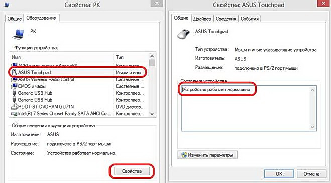 Більш детальну інформацію можна отримати в розділі «Диспетчер пристроїв», де явно видно (візуально відображається актуальний стан використовуваного обладнання) справно працює тачпад і підключений до системи манипуляторное пристрій (оптичного або механічного типу мишка).