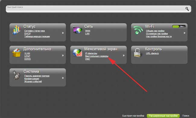 Тепер у налаштуваннях необхідно знайти пункт «Міжмережевий екран – Віртуальні сервери»: