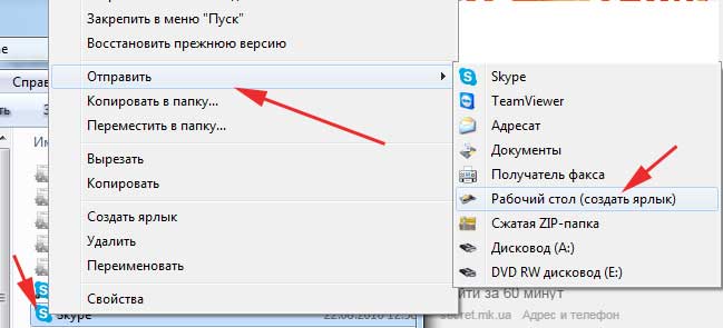 Клікаємо по файлу Skype.ехе правою кнопкою миші і відправляємо його на робочий стіл, роблячи таким чином ярлик: