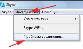 На цьому з налаштуваннями роутера ми закінчили. Переходимо до програми скайп. Тиснемо «Інструменти – Проблеми з’єднання…»