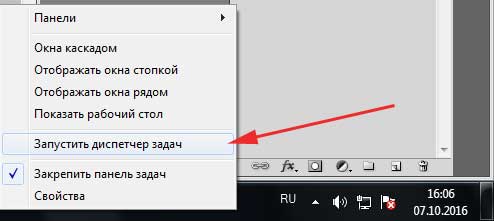 Після запуску знову виходимо з скайпу і перевіряємо, щоб його не було в запущених процесах. Для цього натискаємо правою кнопкою миші по панелі завдань і вибираємо з випавшого меню виберіть пункт «Запустити диспетчер завдань»: