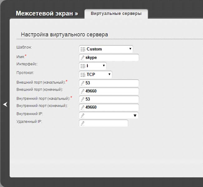 Пишемо значення зовнішнього і внутрішнього порту, як показано на скріншоті і даємо назву свого віртуального сервера, «skype».