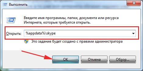Знаходимо розташування папки скайпу під назвою AppData. Для цього викликаємо вікно «Виконати» за допомогою команди Win+R. У віконці пишемо команду %APPDATA%Skype. І тиснемо на «ОК».