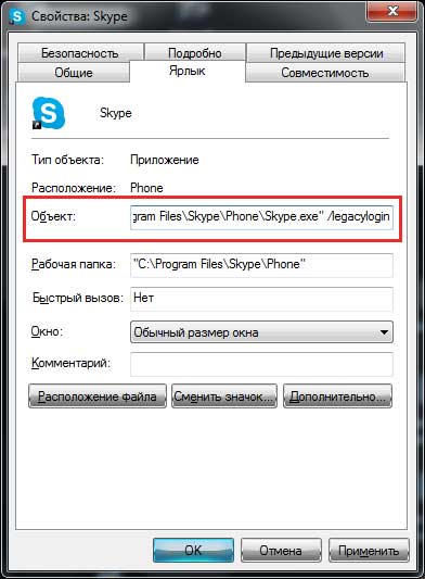 Виправляємо помилку з’єднання скайпу через властивості ярлика