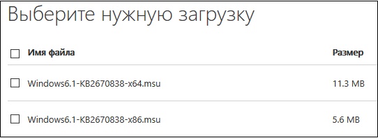 - Завантажте оновлення платформи Віндовс 7 з сайту Microsoft. Перейдіть за вказаним посиланням, натисніть «Скачати». Ви побачите два файлу, з згадкою x64 – для 64-бітної ОС, і x86 – для 32-бітної. Виберіть файл, який відповідає вашої ОС, і скачайте його на ваш ПК (але не запускати).