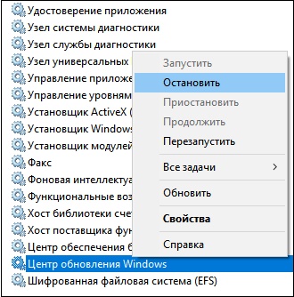 - Вимкніть службу «Центр оновлення Віндовс». Натисніть Win+R, з’явилася рядку введіть services.msc і натисніть Enter. У вікні служб знайдіть службу «Центр оновлення Віндовс», наведіть на неї вказівник миші, клацніть ПКМ, і виберіть «Зупинити»;