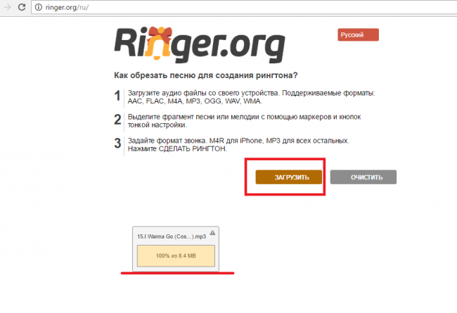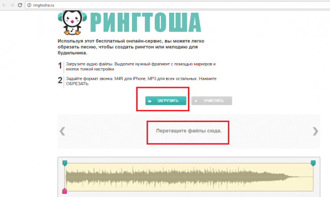 Перед початком роботи на сайті натисніть «Завантажити», перетягнувши в цей пункт потрібний трек. Почекайте деякий час і доріжка виявиться у спеціальному полі для редагування аудіо.
