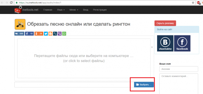 Inteltools надає своєму користувачеві близько 150 інструментів, за допомогою яких можна обробляти аудіофайли. Серед таких можливостей обрізка аудіо. Для створення рингтон для телефону виберіть бажаний трек на пк і перетягніть на головну сторінку сайту, або натисніть «Вибрати».