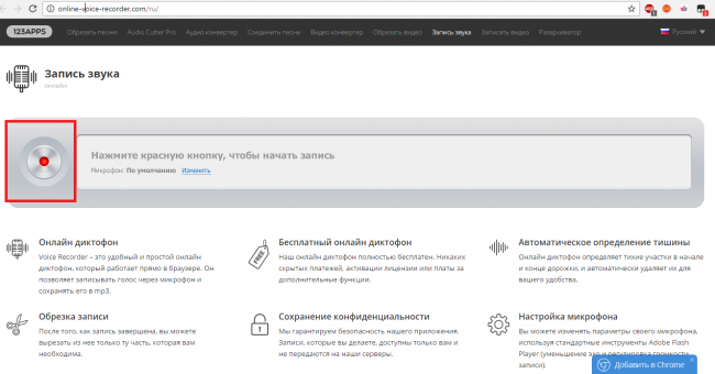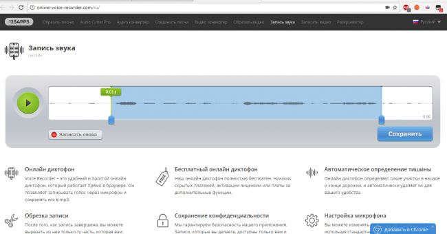 Онлайн-рекордер сайт не тільки дає можливість редагувати аудіо файли формату, але і створювати власний скрінкасти – додавати коментарі до записаним раніше роликам. Щоб записати голос натисніть, стандартну для цієї справи кнопку Record.