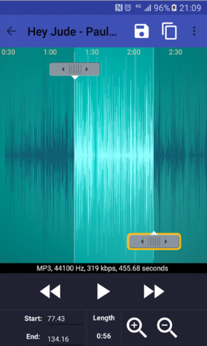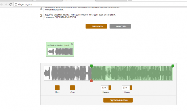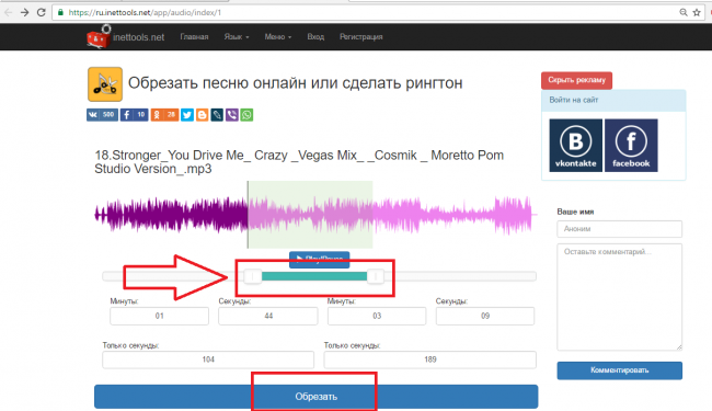 Як зазвичай дочекайтеся завантаження і формування аудіодоріжки. Тепер виділіть необхідний фрагмент, вже описаними способами – за допомогою повзунків. Як тільки вся обробка доріжки завершена – обріжте трек. Обрізка відбувається протягом 20-30 секунд.