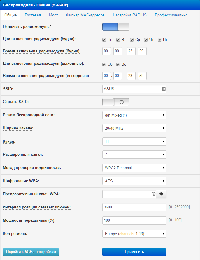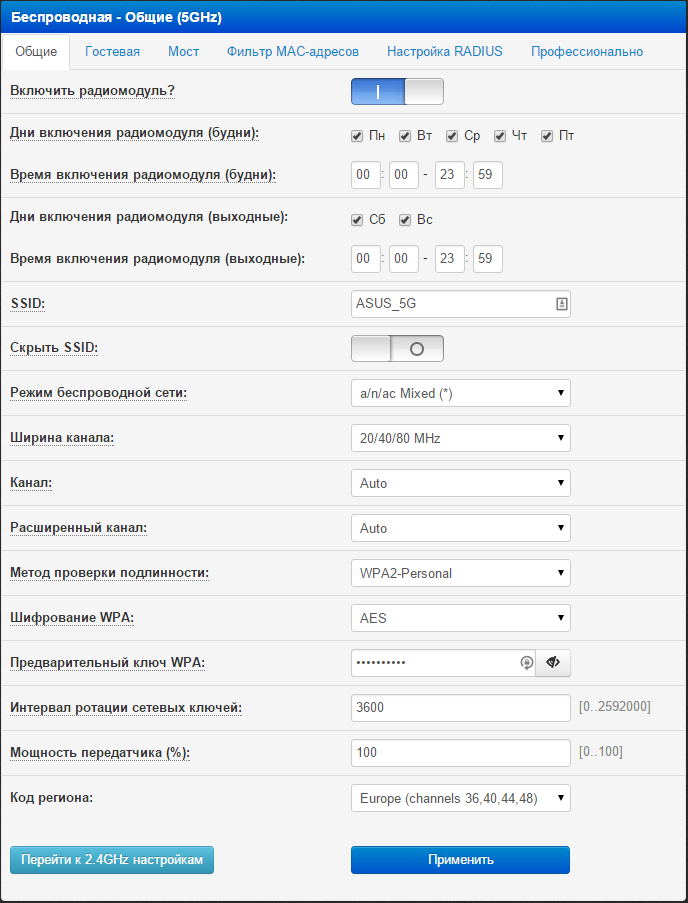 Налаштування бездротової мережі 2.4.Ghz. Можна налаштувати основні параметри, відкрити гостьовий доступ, підключитися використовуючи технологію розширення покриття бездротової мережі (WDS), заборонити певним клієнтам доступ по MAC, налаштувати додаткові параметри авторизації через сервер RADIUS і (вкладка «Професійно») побачити безліч незрозумілих параметрів тонкої настройки мережі, які краще не чіпати)))))