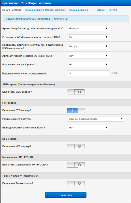 Налаштування USb-накопичувачів, торрент-клієнта, медіа-сервера, FTP, підключення USB-модему та принтера для загального використання.