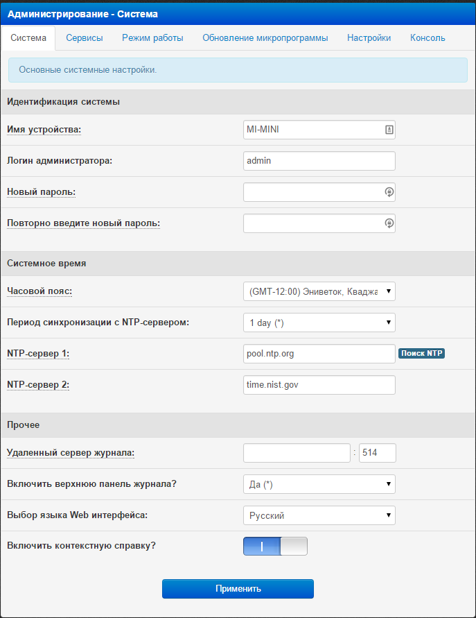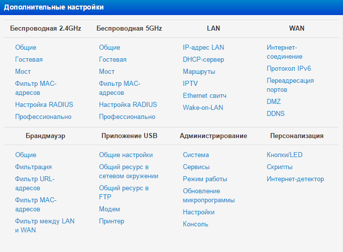 Загальні налаштування роутера, налаштування сервісів, режим роботи роутера, оновлення ПО пристрою, бекап/відновлення налаштувань, робота з консоллю.