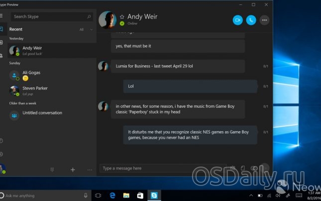 Оновлення приносить новий додаток Skype до вже наявного. Ніяких незвичайних функцій тут немає, хіба що підтримка темного інтерфейсу. Виглядає він досить привабливо, але сенс його існування зрозуміти досить важко, коли є перевірений часом традиційне додаток.