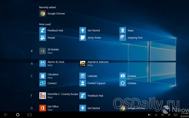 Змінено меню «Пуск». Тепер воно відразу при відкритті показує список всіх програм, а зверху найбільш часто використовуються. Ліворуч знаходяться кнопки вимикання і Параметри. Планшетний режим показує список всіх додатків на весь екран. Детальніше про меню «Пуск» можна прочитати в окремій статті.