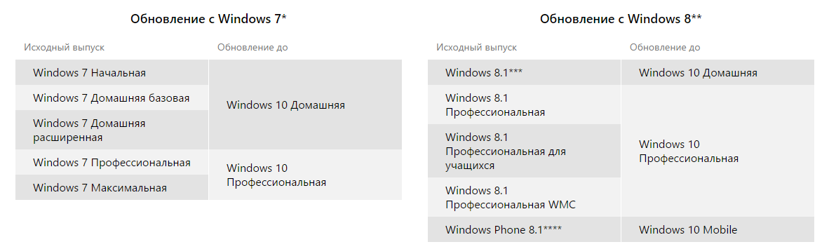 Відповідність редакцій Windows 7, Windows 8.1 і Windows 10