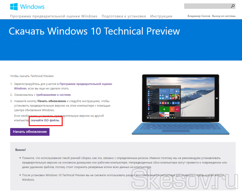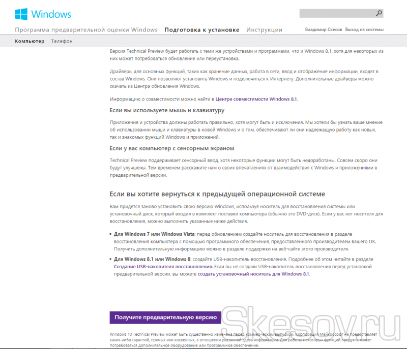 Перше, нам необхідний образ Windows Technical Preview для установки. Звичайно ж, вони вже доступні на торент, я ж скачав з самого офіційного місця, а саме insider.windows.com заходимо під своїм обліковим записом Windows (якщо її немає, створюємо), гортаємо вниз і вибираємо Get started — PC.