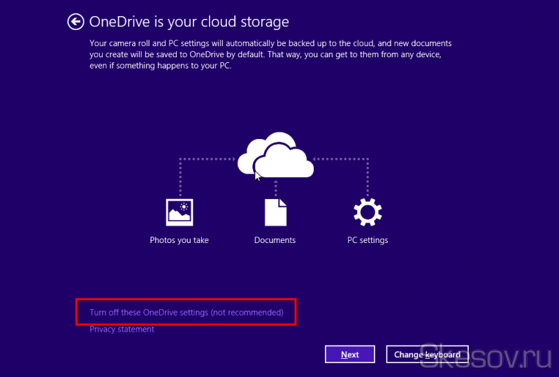 До речі, я ще не писав про це, але в оновлених установники Windows 8.1 можна відключити синхронізацію OneDrive ще на етапі установки ОС. Така ж можливість є і тут. Просто тиснемо Turn Off.