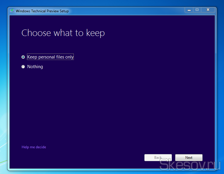 Піде процес підготовки для оновлення системи. Після чого з’явиться вікно з вибором того, що зберігати при оновленні. Так як у мене в принципі чиста система, був вибір тільки між «Зберегти особисті файли» або «Нічого не зберігати». Якщо хочете повністю очистити системний диск, то вибирайте Nothing, я ж пішов по першому шляху.