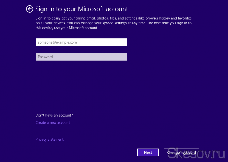Після установки з’явиться майстер початкової настройки ОС, точно таке ж як в ОС Windows 8.1/8 і перше його вікно введення даних облікового запису microsoft. Можна відмовитися натиснувши посилання що у вас немає облікового запису і відмовити від реєстрації. Я ж використовую її з виходу Windows 8 і вважаю одним з найбільш зручних нововведень, якщо хочете потім відключіть пароль при включенні.