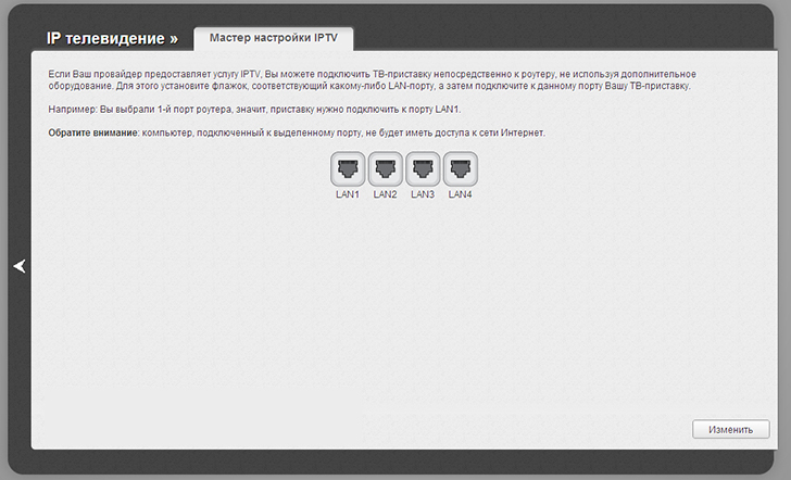 Налаштування IP-TV для прошивок 1.3.x 1.4.x практично не відрізняється. На початковій сторінці роутера тиснемо «Налаштувати IPTV» (якщо у вас прошивка 1.3.x) і «Майстер налаштування IPTV», якщо у вас прошивка 1.4.x. Після цього вам необхідно буде вказати порт для підключення IP-TV приставки (Інтернет через цей порт працювати не буде). На початку статті я рекомендував з’єднати приставку з портом 4. Якщо ви це зробили — вказуємо порт 4 і охороняємо зміни. На цьому налаштування IP-TV завершена.