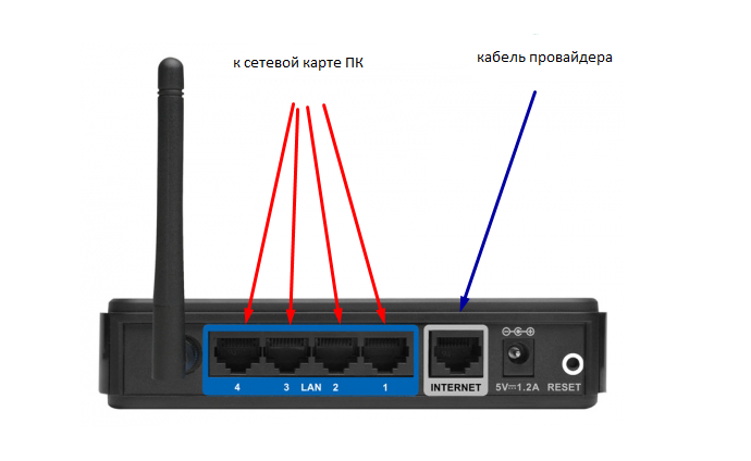 На тильній стороні роутера є 5 роз’ємів. Роз’єми «LAN» для підключення пристроїв вашої локальної мережі і роз’єм «Internet» для підключення кабелю провайдера. Вам необхідно підключити кабель провайдера в роз’єм «Internet», а мережеву карту комп’ютера, з якого ви будете налаштовувати роутер з’єднати з портом LAN (наприклад, з першим). Якщо є IP-TV приставка — з’єднуємо її з 4 портом LAN. Включаємо роутер в розетку.