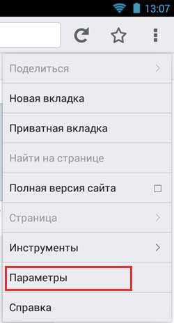 Запускаємо браузер і тиснемо на кнопку меню у правому верхньому куті у вигляді трьох точок у вертикальному положенні. З випав списку вибираємо пункт «Параметри».