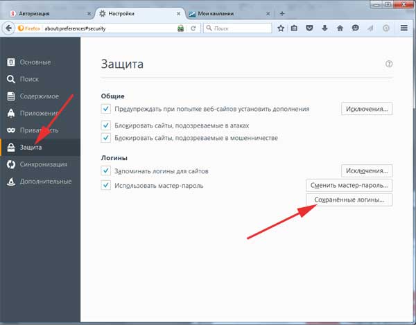 У вікні, що відкрилося, переходимо в розділ «Захист», переконуємося, що стоїть пташка навпроти пункту «Запам’ятовувати логіни для сайтів». Тиснемо на кнопку «Збережені логіни».