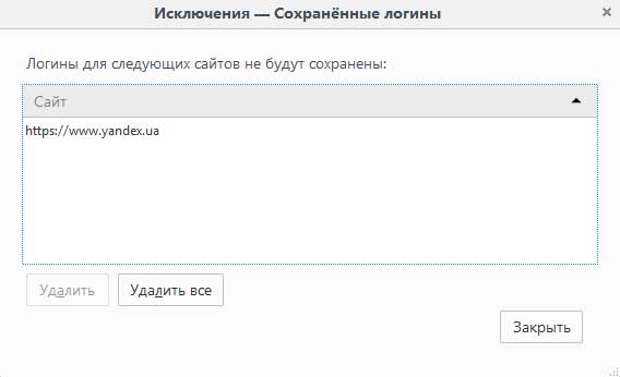 Значить, ці сайти додані виключення. Для того, щоб додати сайт в винятки (його логін і пароль більше ніколи не зберегтися в браузері) досить просто при запиті на запам’ятовування пароля натиснути на кнопку «Запам’ятати» і з випавшого меню вибрати пункт «Ніколи не запам’ятовувати пароль для цього сайту».