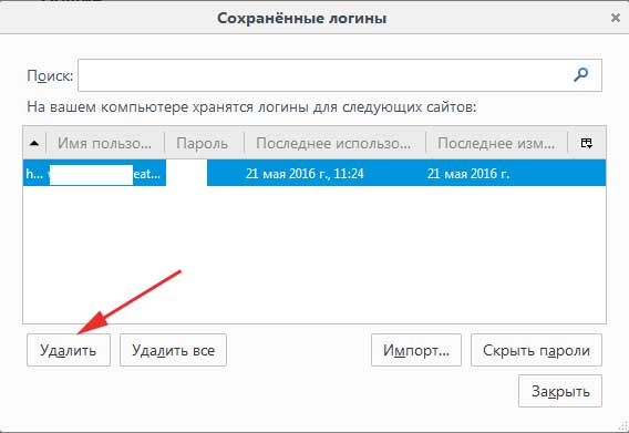 Тепер, крім логінов до сайтів, у нас відображаються ще й паролі. Для того щоб видалити пароль в Мозілі, виділіть необхідний сайт і натисніть на кнопку «Видалити».