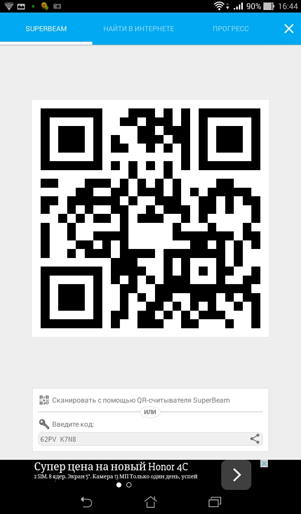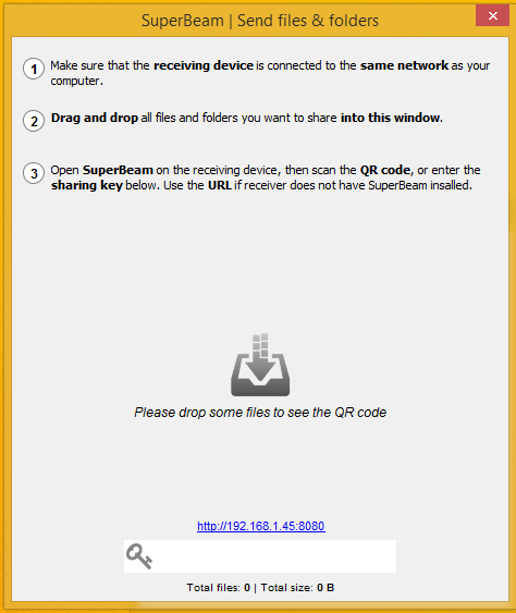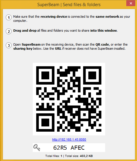 - Відкрийте SuperBeam на приймаючому пристрої, сканувати QR-код, або введіть ключ. Використовуйте посилання, якщо на приймаючому пристрої не встановлено SuperBeam.