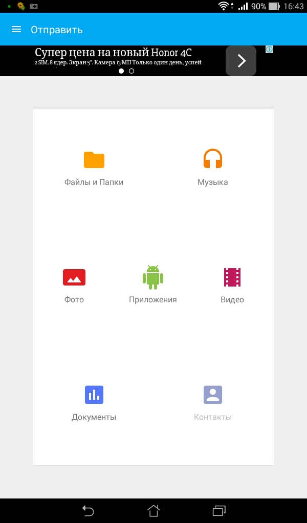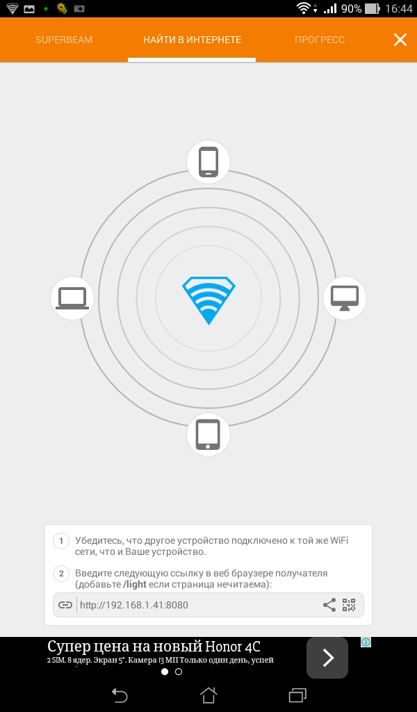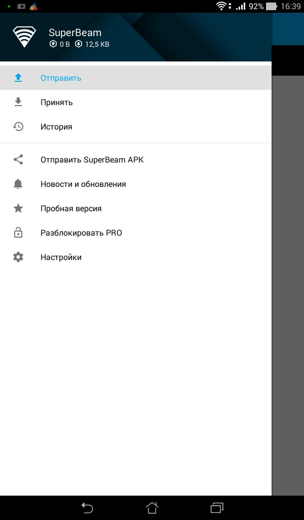 Якщо необхідно відправити файл по wi-fi з планшета на ПК, поступаємо аналогічно. Відкриваємо SuperBeam на планшеті, вибираємо Відправити