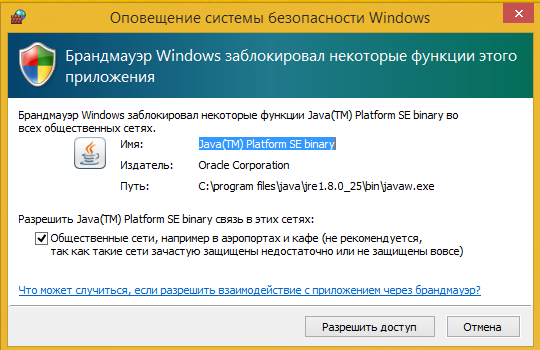 Можливо, брандмауер Windows заблокує роботу Java (а відповідно і програми), якщо ви підключені до загальної мережі або для своєї домашньої мережі ви вказали подібний тип мережі. Тисніть «Дозволити доступ». Вас попередили, правда?)