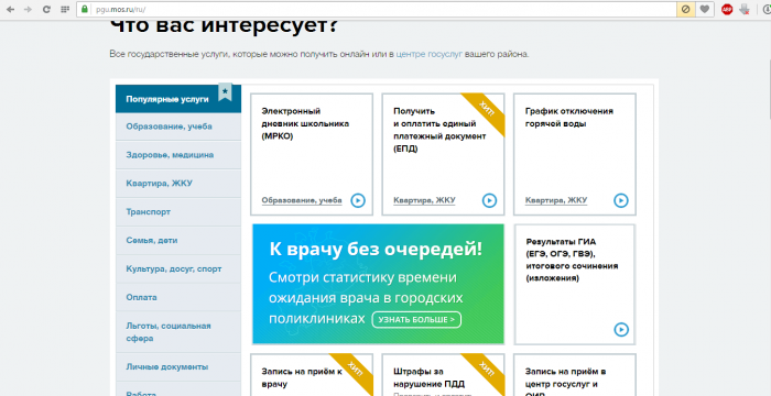 В цілому, для цього і був розроблений подібний сайт пгу мос ру. Але на цьому ж ресурсі можна як оплатити послуги ЖКГ, так і записатися на прийом до чиновників для отримання будь-яких документів, для того, щоб довідатися графіки подачі води або інших ресурсів. Сайт виглядає як на зображенні нижче:
