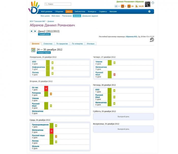 Тут показані такі ж дні з предметами, домашнім завданням та оцінками. Кожна оцінка отримана дитиною і виставлена в паперовий журнал буде перенесена в його електронний щоденник. Але електронний щоденник – це маса преимществ.