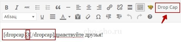 Щоб створити буквицю, виділіть перший символ у тексті та натисніть кнопку Drop Cap в редакторі. Ви помітите, що обрана вами буква буде обведена спеціальним шорткодом.