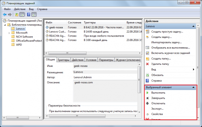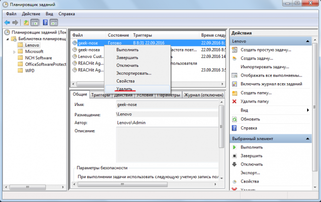 Всі редагування вже створених завдань виконується безпосередньо в самому вікні планувальника, в його центральній частині. У цьому пункті, можна зробити наступне: