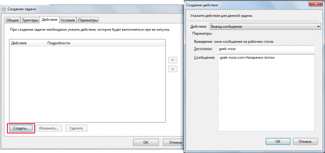 – Так само створюємо чергову дію через однойменну вкладку «Дія» і тиснемо «Створити». У вікні вибираємо пункт «текст повідомлення», вводимо його і підтверджуємо.