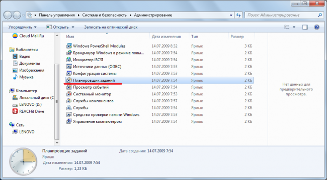 – Перед Вами виявиться цілий ряд програм, які мають можливості адміністрування Віндовс. Серед цього списку Вам потрібен саме «Планувальник завдань». Запускається він за стандартом.