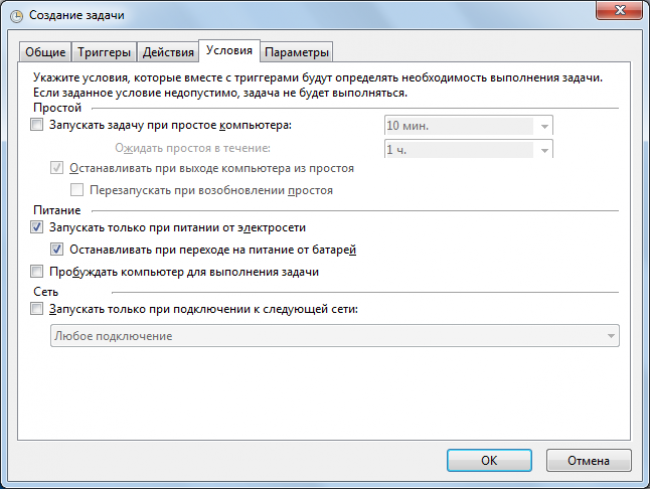 – Переходимо в «умови» і задаємо потрібні умови. Тут потрібно буде вказати, що завдання потрібно виконувати при перезапуску ПК, протягом певного часу. Всі параметри можуть встановлені в цьому пункті.